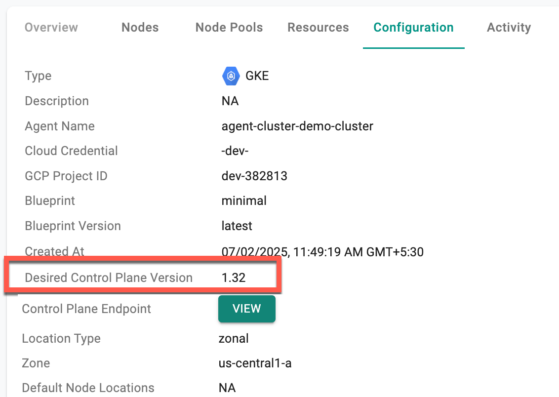 - The Configuration tab displays both the Desired Control Plane Version and the GKE Control Plane Version, with the last synchronized timestamp shown for reference.