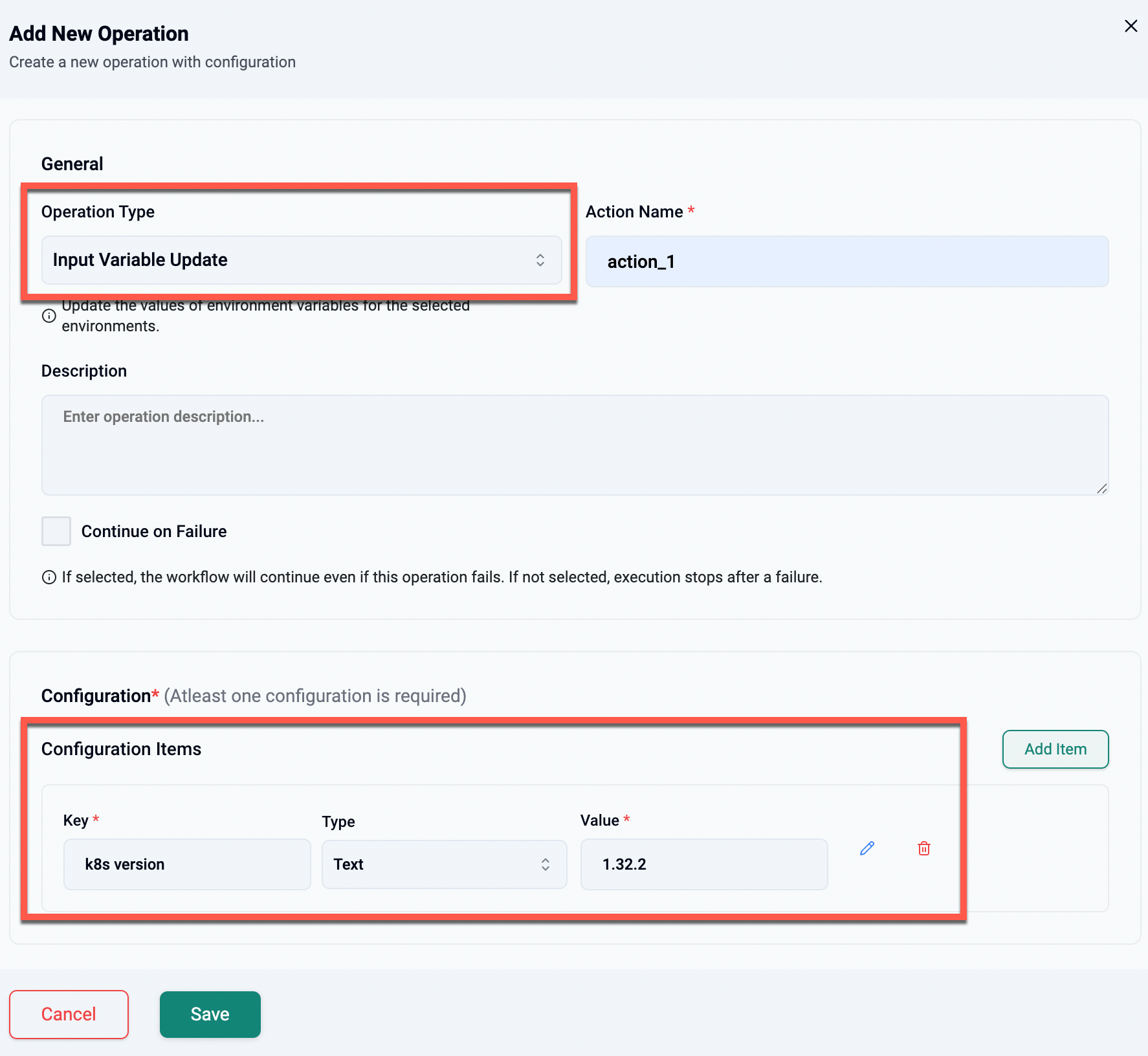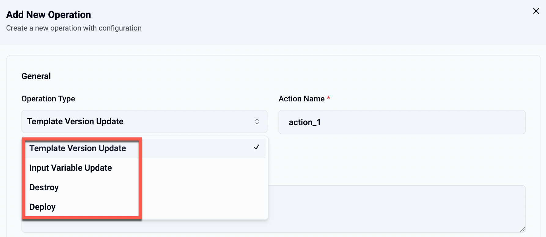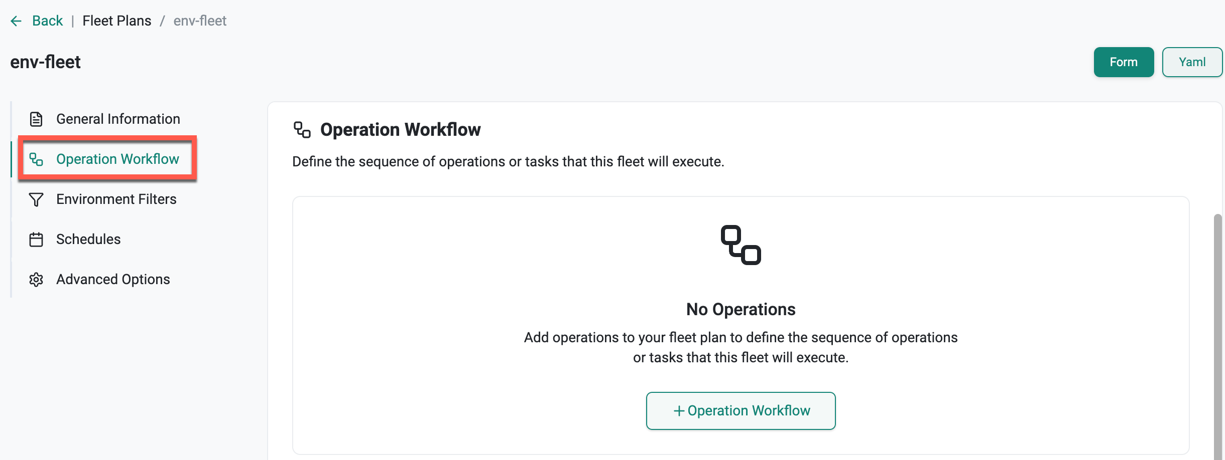 The Operation Workflow defines the sequence of operations or tasks that a fleet plan will execute on the selected environments. Operations can be configured step by step and support different lifecycle actions such as upgrading template versions, updating variables, or managing resources.