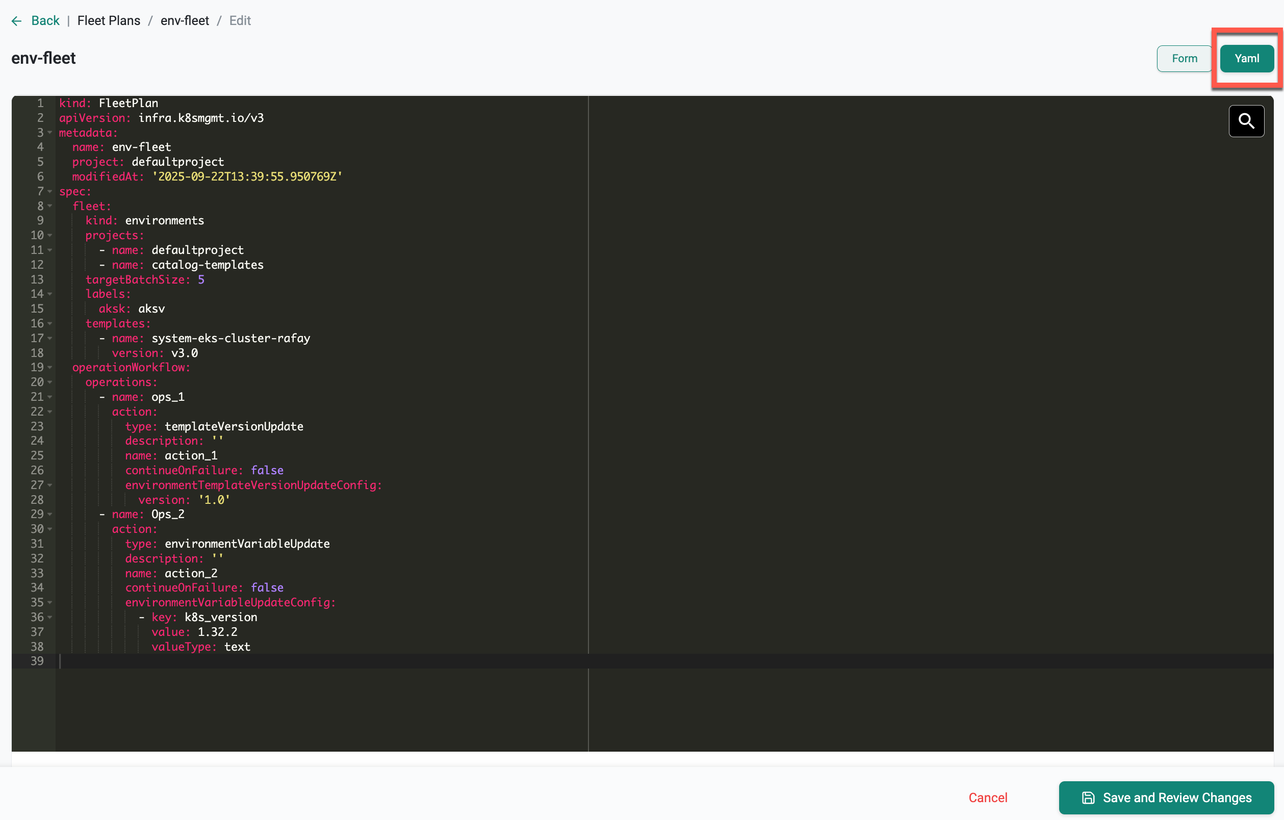 When you click YAML, the editor opens up the raw YAML view of the Fleet Plan
