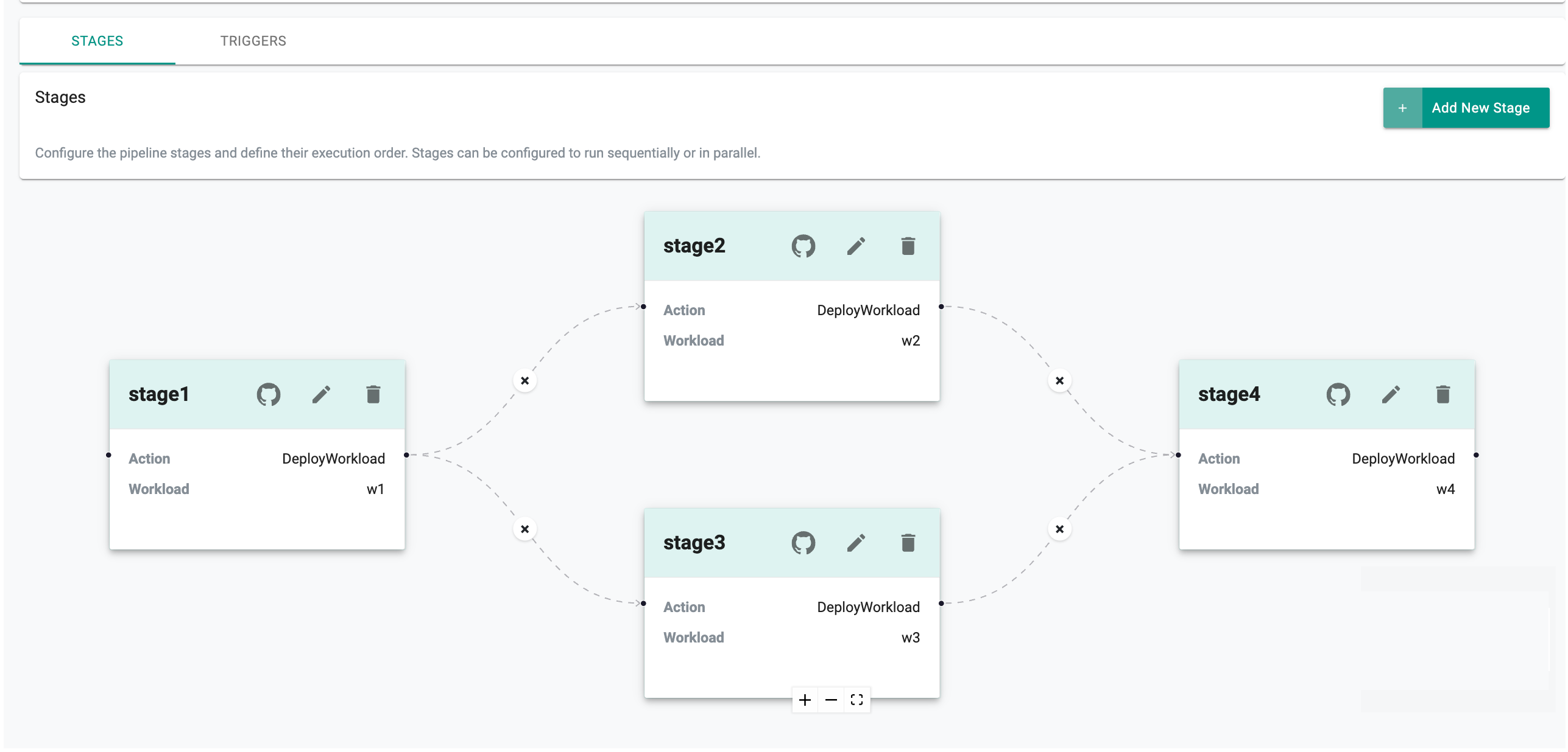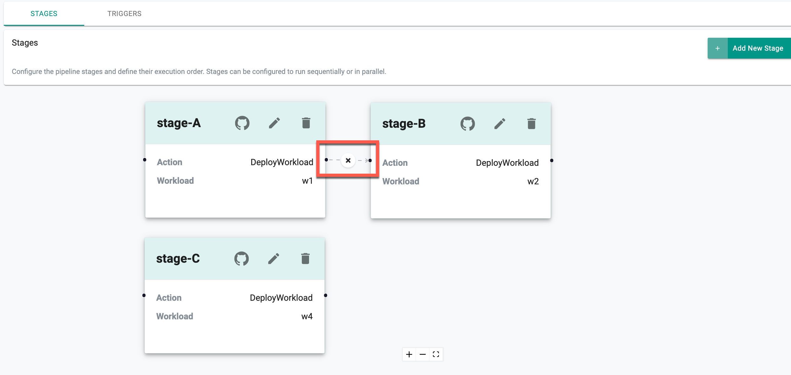 If stages are not connected, they will run in parallel. To remove a connection, click the ✕ icon on the connector line. This provides full flexibility to mix sequential and parallel execution paths in a single pipeline.