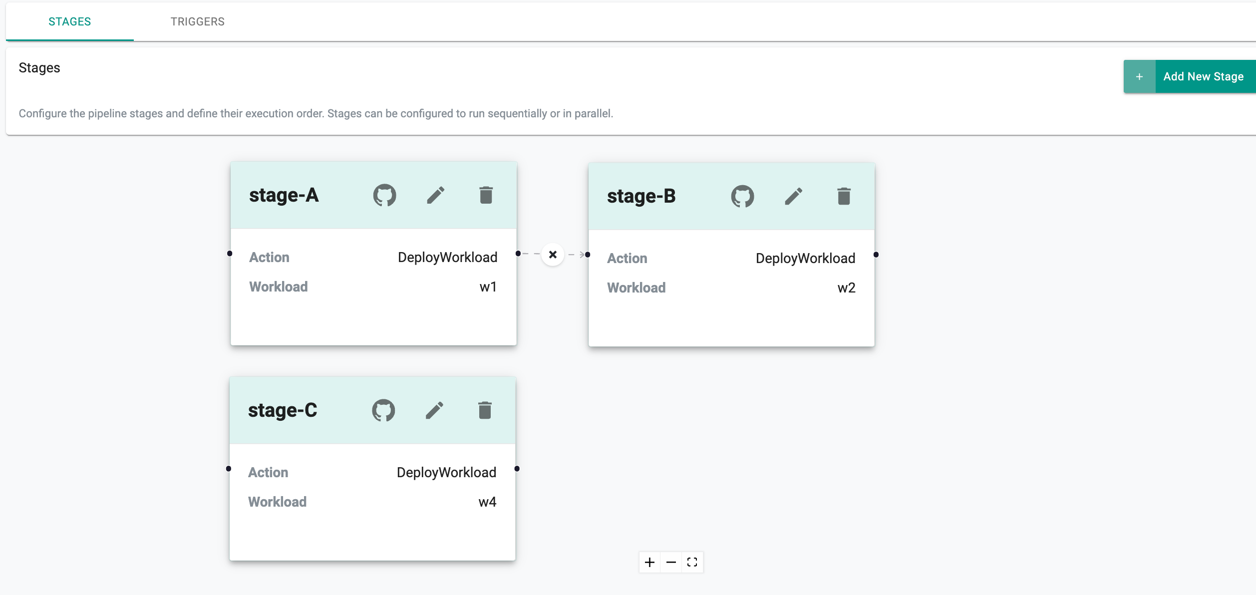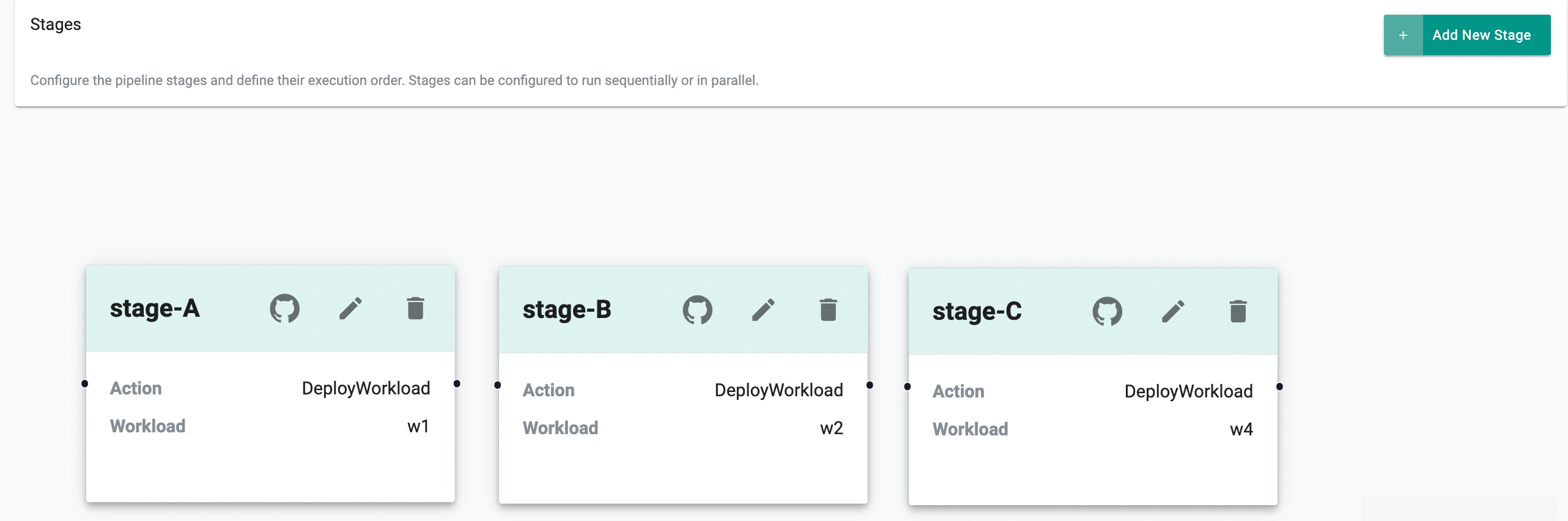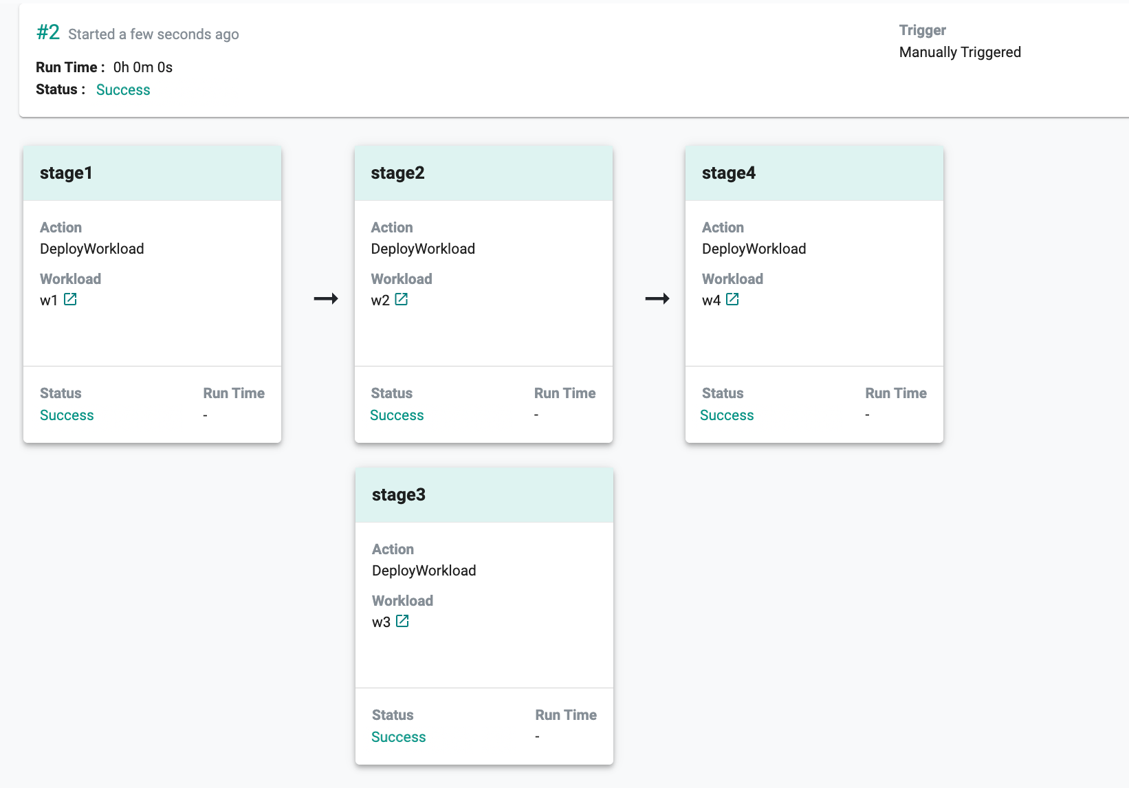 - Stage3 deployed Workload w3. Both stages ran independently without waiting on each other.