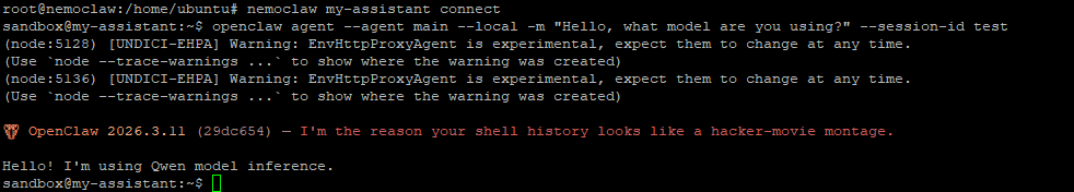openclaw agent --agent main --local -m "Hello, what model are you using?" --session-id test