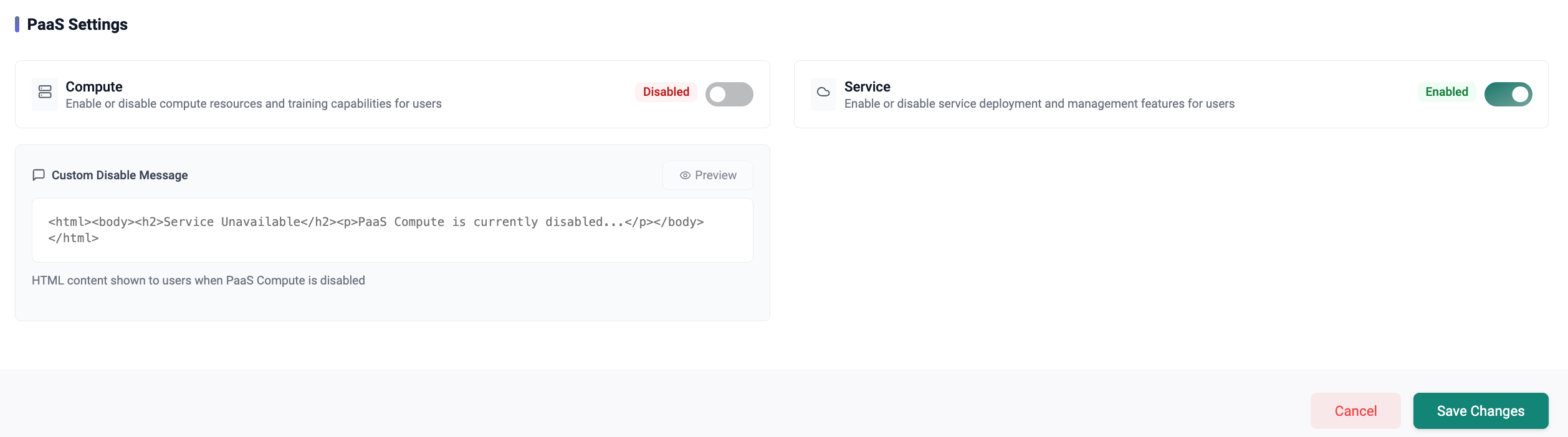 The PaaS Settings section allows administrators to manage provisioning control for compute and service instances. When disabled, instance creation is blocked and a custom message is shown to users.