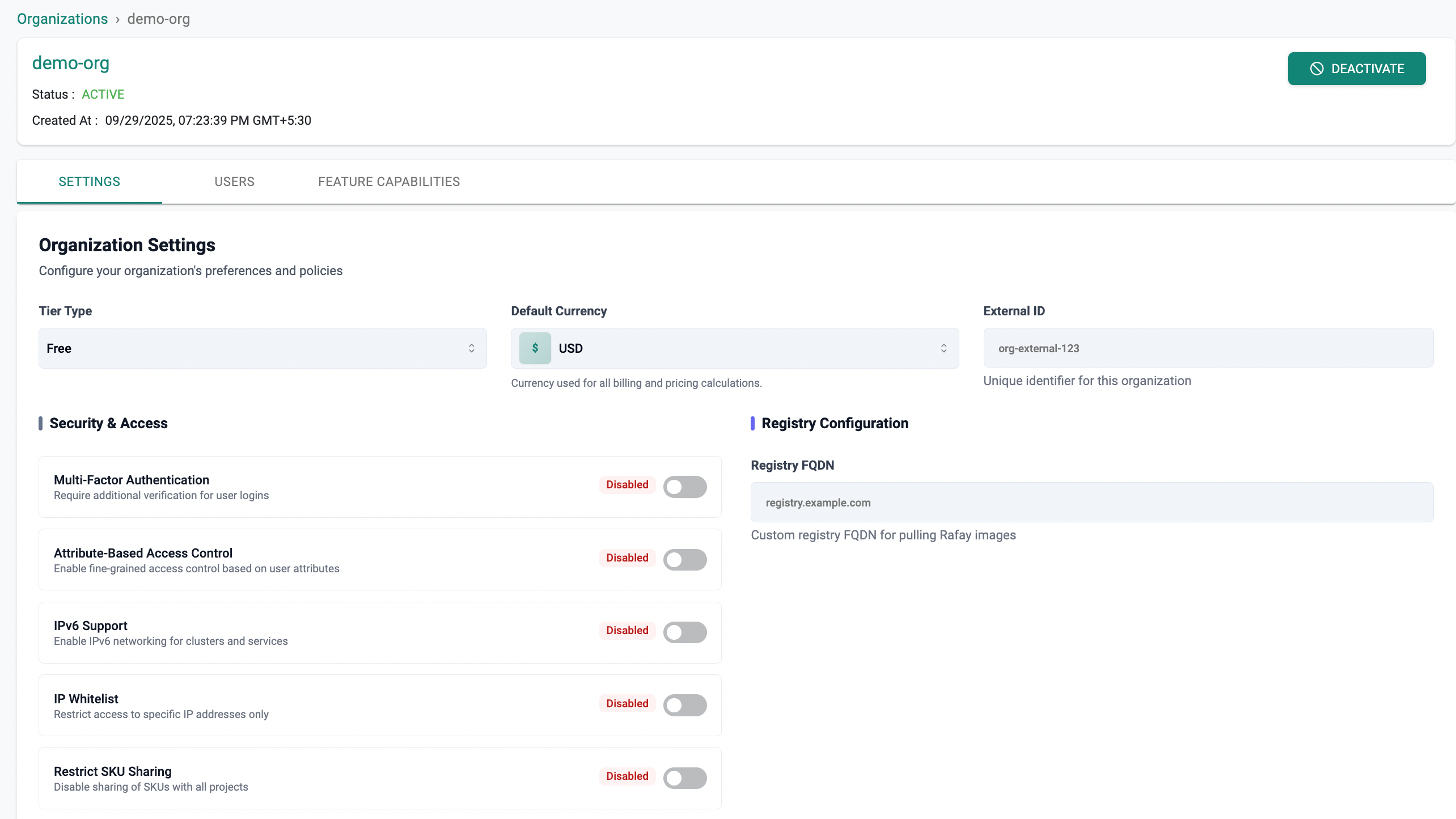 Click Deactivate button to deactivate the organization. This blocks all the users within this organization from accessing it. A good example for this action is when an end customer is delinquent on their payments.