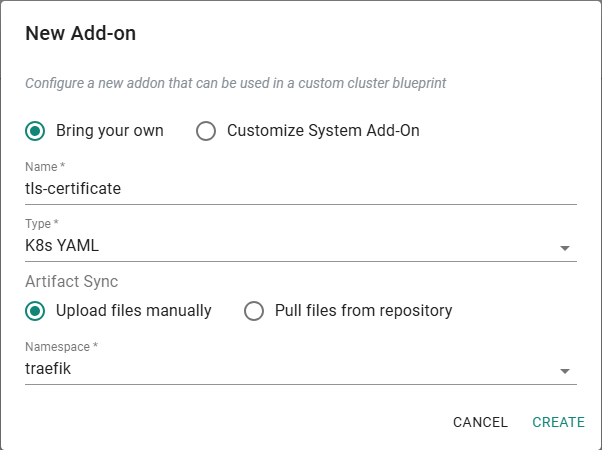 • Click the + symbol to add the tls-certificate and traefik add-ons to the blueprint