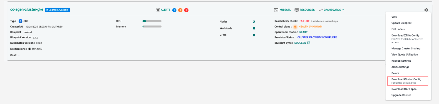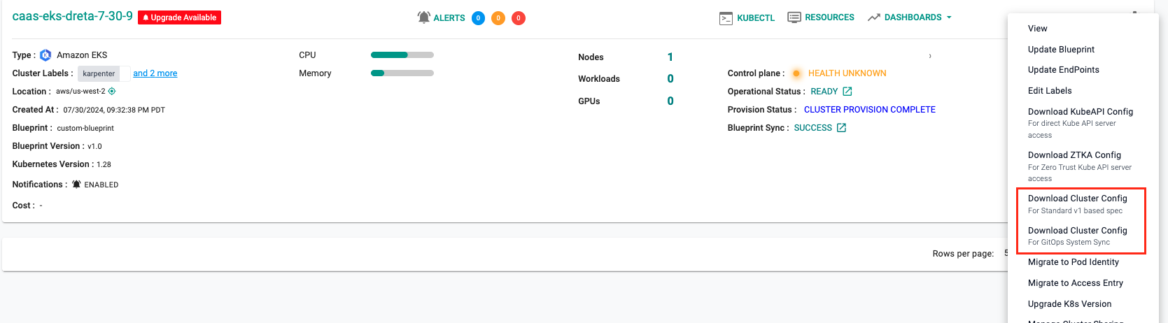 The UI now allows users to easily download cluster configuration specifications directly. You can retrieve the GitOps System Sync (v3) spec for all cluster types, as well as the standard v1 cluster spec for EKS and AKS.