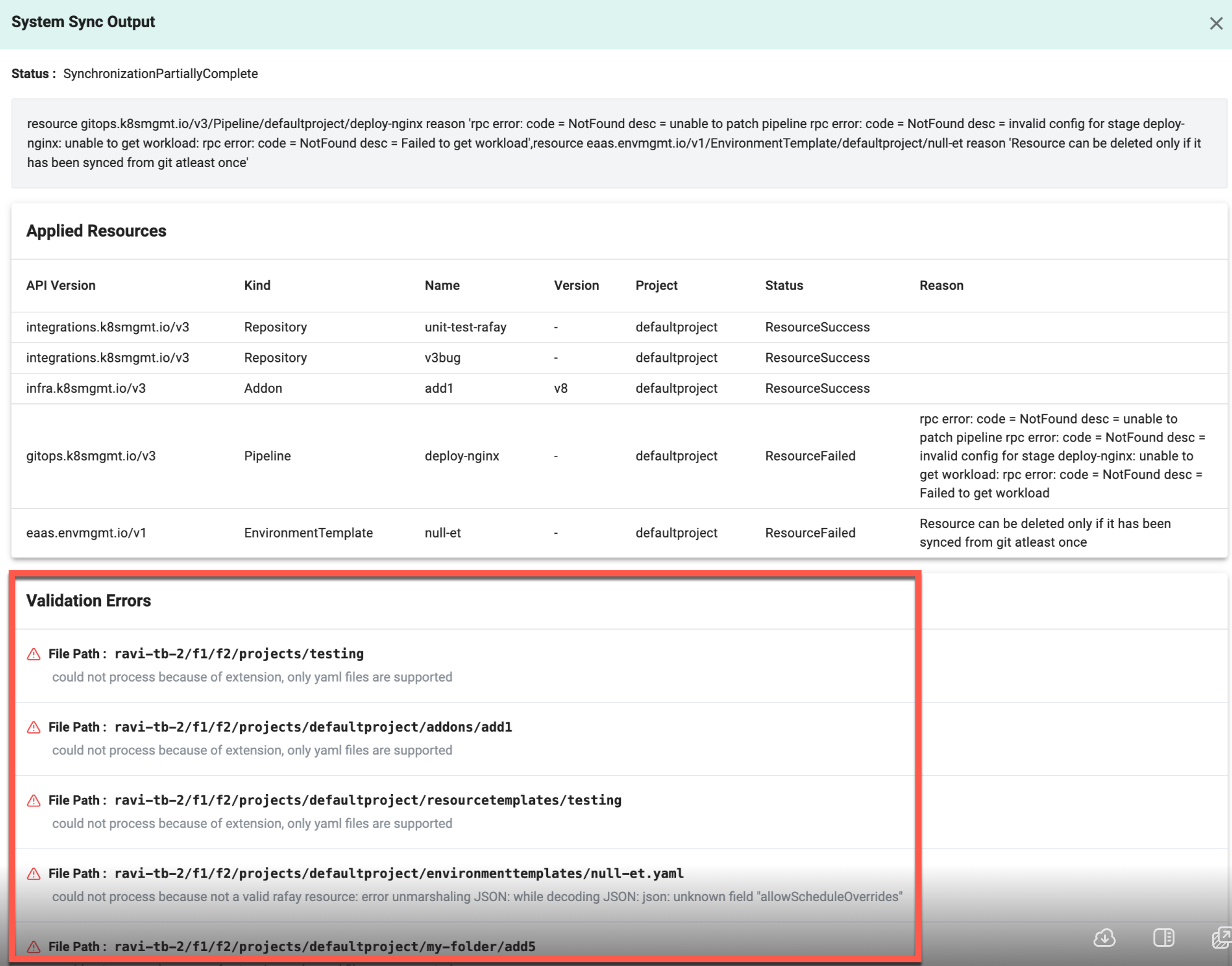 apiVersion/kindcombination is invalid, missing, or not registered. These issues previously produced no feedback but are now surfaced clearly. - After file and API checks pass, System Sync validates that all fields in the resource spec comply with the expected schema. This identifies issues such as misspelled field names, extra or unsupported fields and incorrect field structures