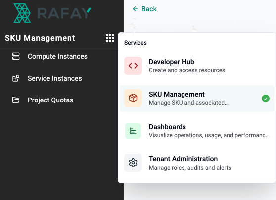 - SKU Management – Allows Tenant Admins to manage SKUs and their associated configurations, such as sharing settings and project-level quotas.