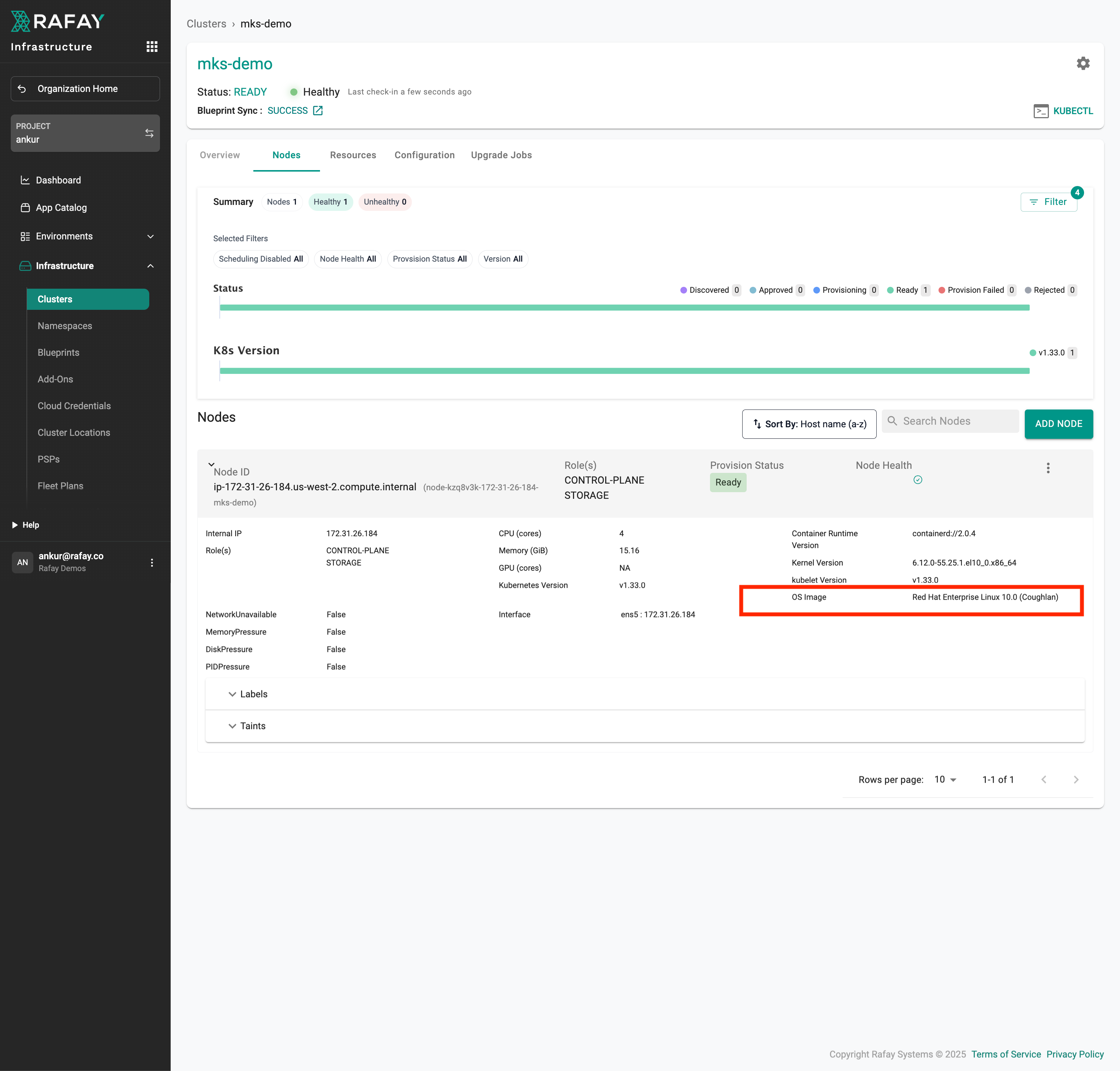 Support has been added for Red Hat Enterprise Linux (RHEL) 10 operating system. This allows customers to leverage RHEL 10 based nodes for Rafay MKS clusters.