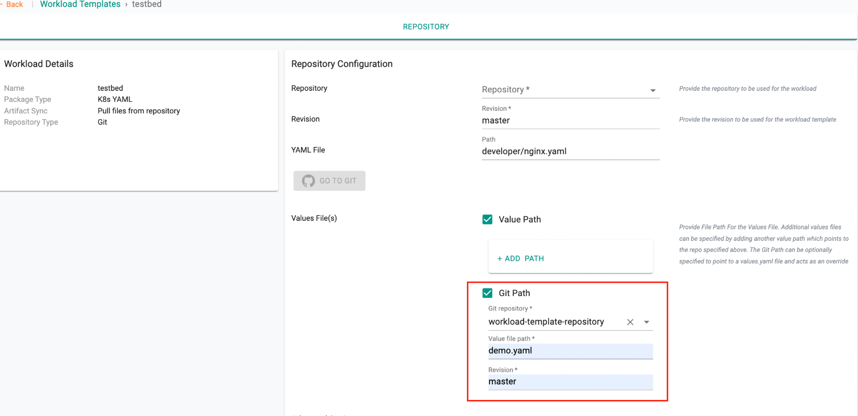 The Git Path option for specifying values files is now supported for workload templates.
