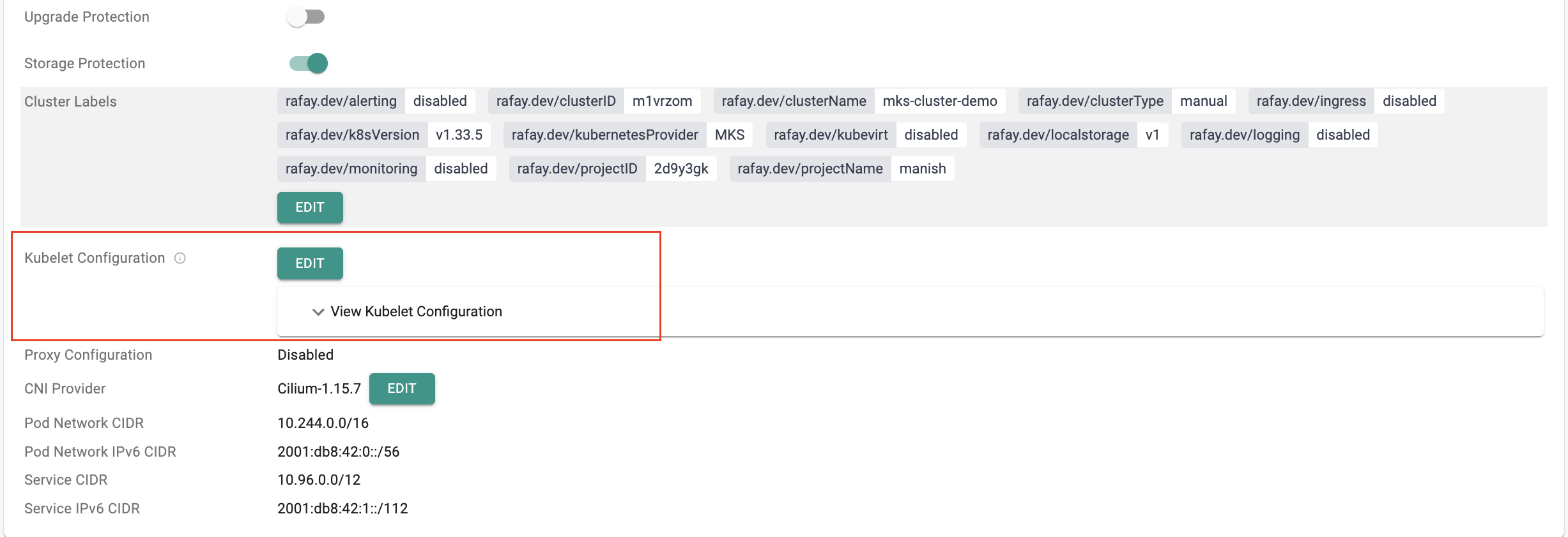rafay_mks_cluster: Added support for kubelet configuration overrides at cluster and node levels. Supports both traditional key-value arguments and structured KubeletConfiguration YAML, enabling fine-grained control over kubelet behavior. Refer to this example for implementation details.