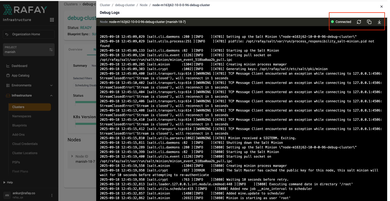 Previously users had to ssh to the nodes to see these logs, now this option is available on the every node card with an option to view/download debug logs.