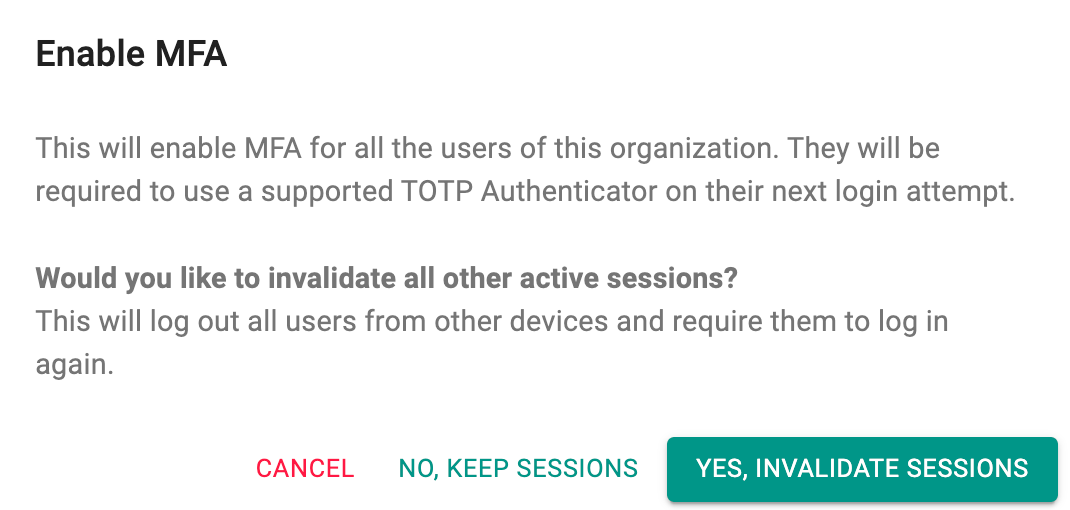 - YES, INVALIDATE SESSIONS – Enables MFA and logs out all users.