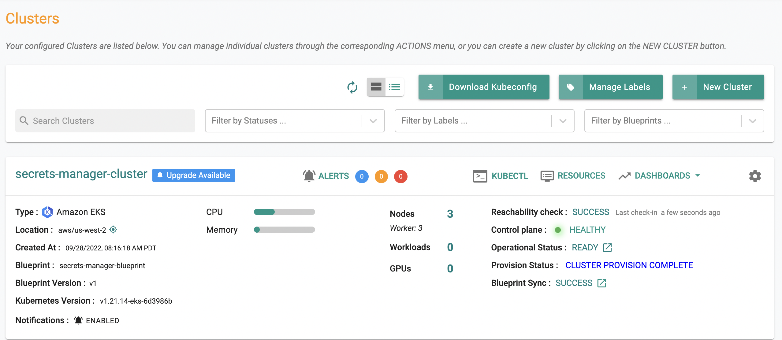 One or multiple Kubernetes clusters can exist in a Project. In the example below, an Amazon EKS cluster has been provisioned in the Project.