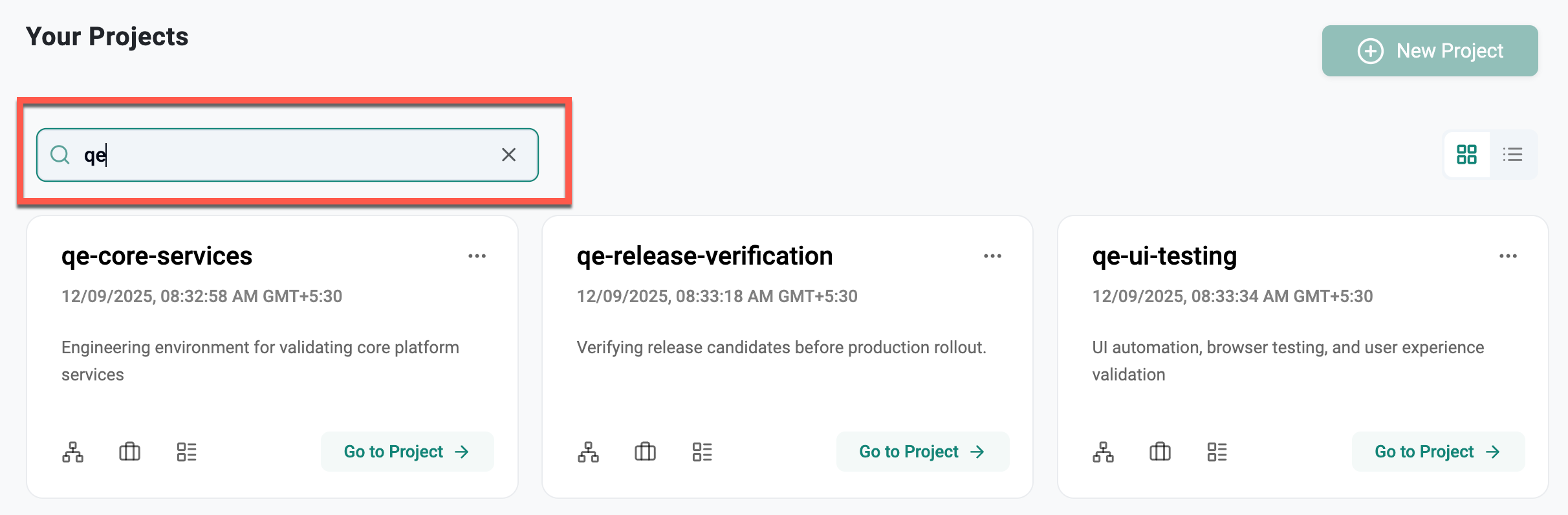 Users within a project can switch to another project using the search bar. When a user initiates a search with a specific letter(s) (for example, qe), the system auto complete the search and list out all the project names corresponding to the entered text (qe) as shown in the below example