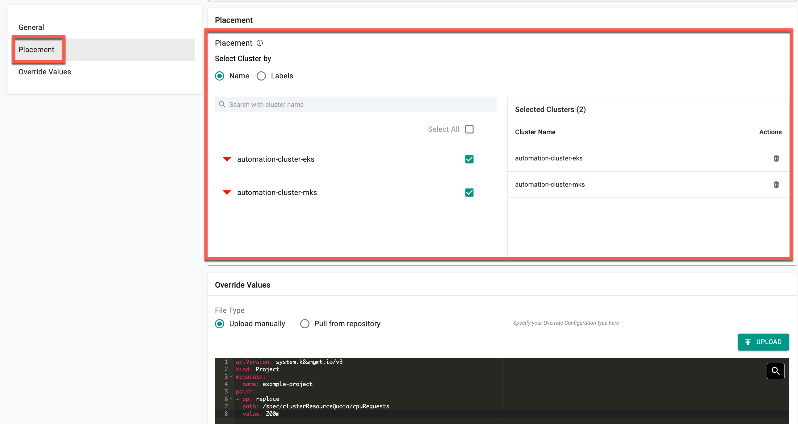 - In the Placement section, choose how you want to select clusters: