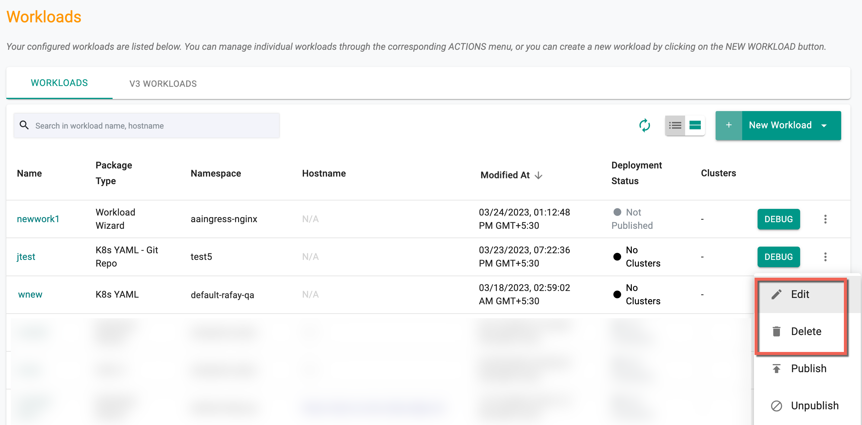 Edit or delete one (or) more workload(s) using the respective icons from the main workloads list page. Follow the prompts to delete a workload.