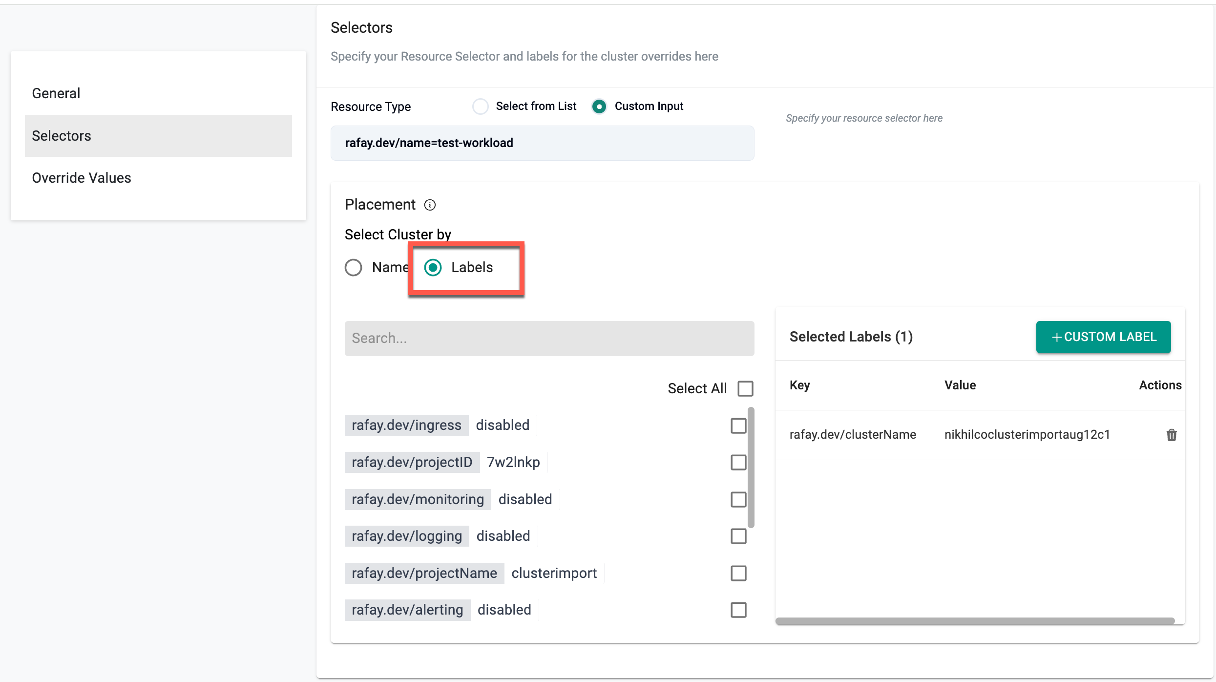 Platform resources such as addons and workloads utilize labels which are added by the platform or by the end user. These labels are used as selectors for both the resource they will be applied as well as the clusters where the cluster override will be applied.