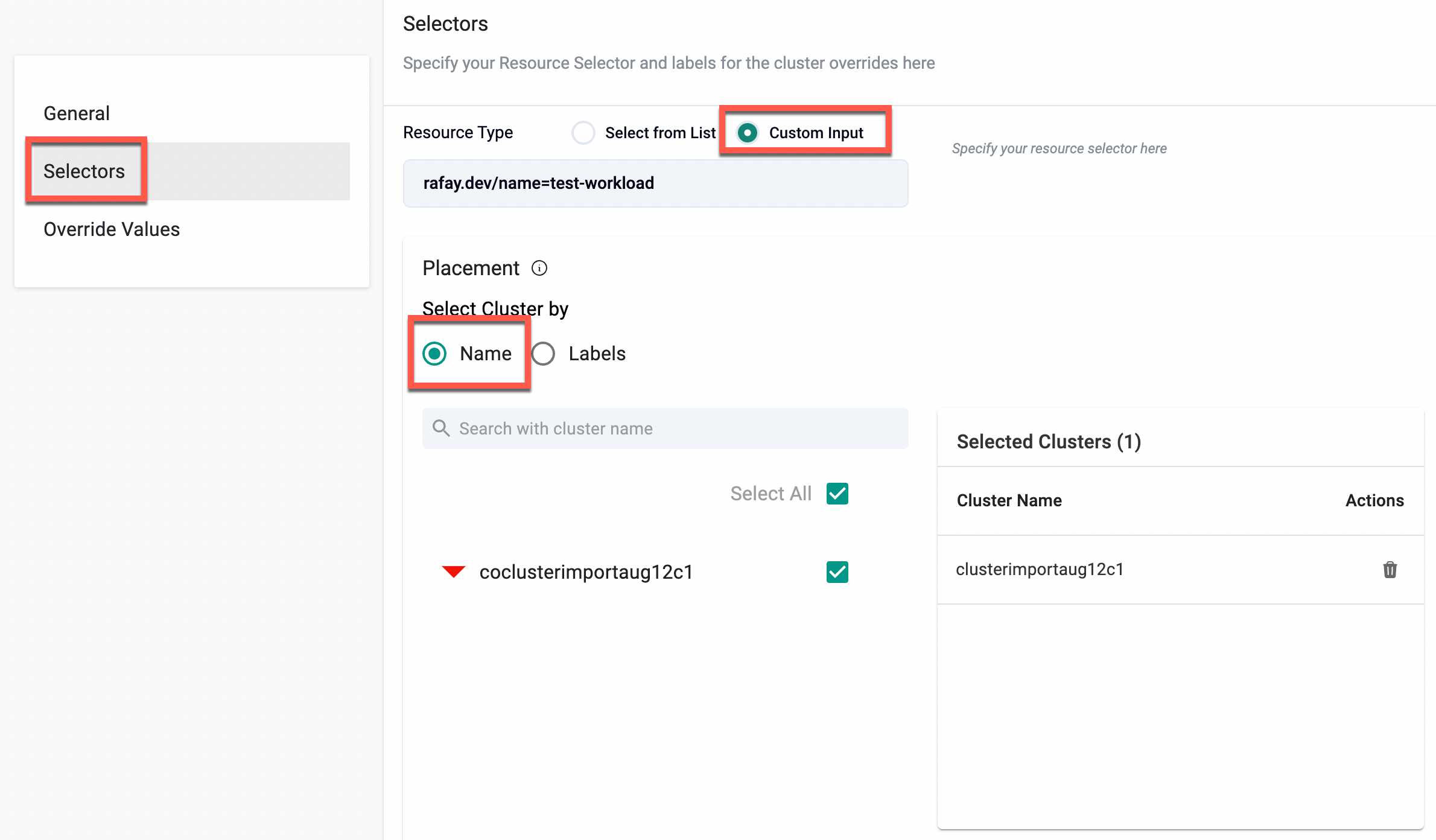 - Select the required Resource Selector and Placement type. The example below shows the Specific Cluster type