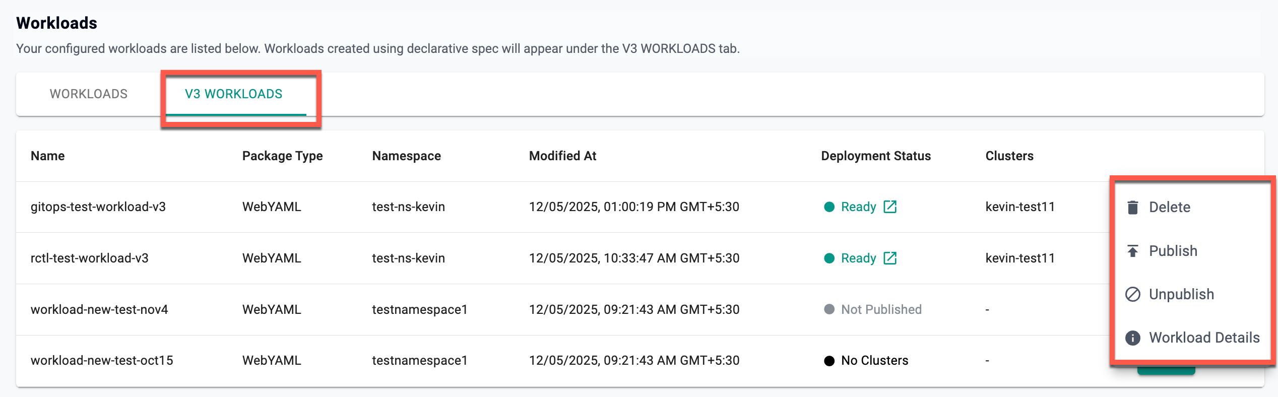 Click the V3 Workloads tab to view workloads created using declarative specifications. V3 workloads can be created using System Sync (Git Sync), RCTL with the --v3 flag, V3 Swagger APIs, or Terraform.